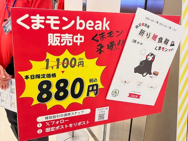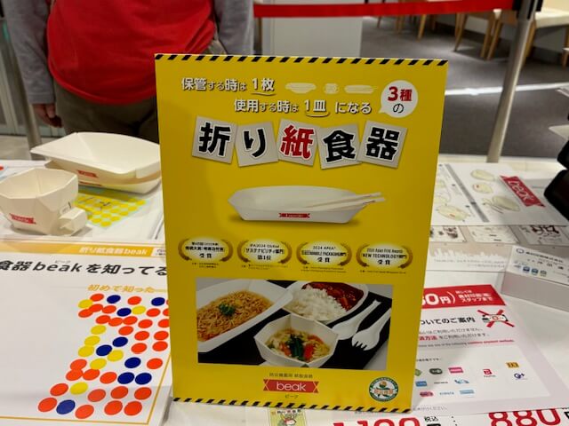 A4サイズの防水・耐油性の紙を折るだけで、皿・カップ・丼の3種類が作れる製品です。糊もハサミも不要で、能登半島地震の際にも被災地へ届けられたそうです。今回は熊本県との協力により「くまモンバージョン」も登場していました。
