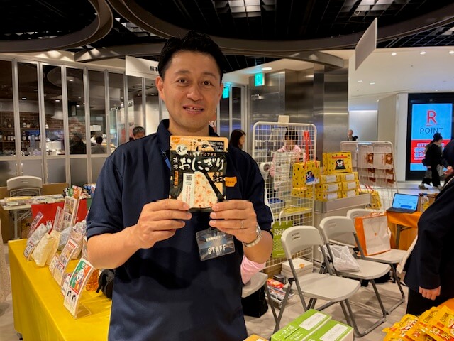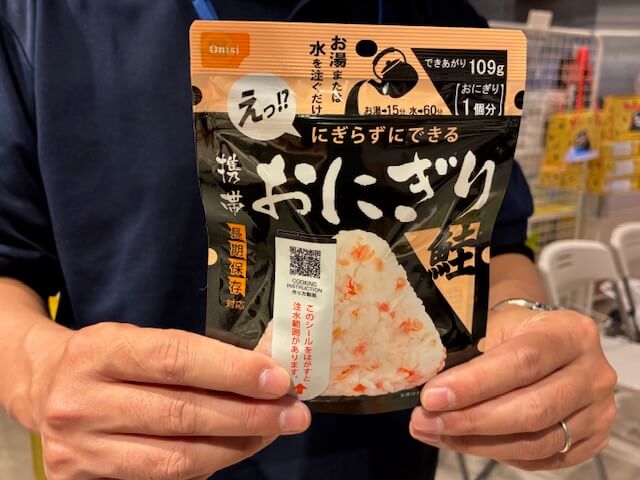備蓄食の尾西食品のブースには人気の「携帯おにぎり」という保存食がありました。