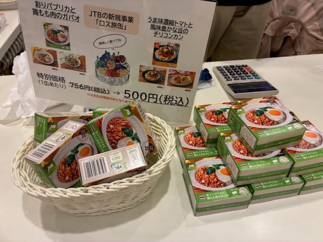 JTBのブースでは、規格外野菜(ロス食材)を35%使用した「ロス旅缶」が紹介されていました。