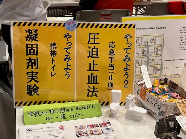 災害時に深刻な問題となるトイレ不足に対し、校内の約60か所の洋室トイレの個室内にあらかじめ携帯トイレ(凝固剤)や生理用品を配備、ドアの内側に使い方の説明を掲示することで生徒たちが日常的に目にし、特別な教育を受けなくても自然と使い方が身につく工夫がなされているそうです。