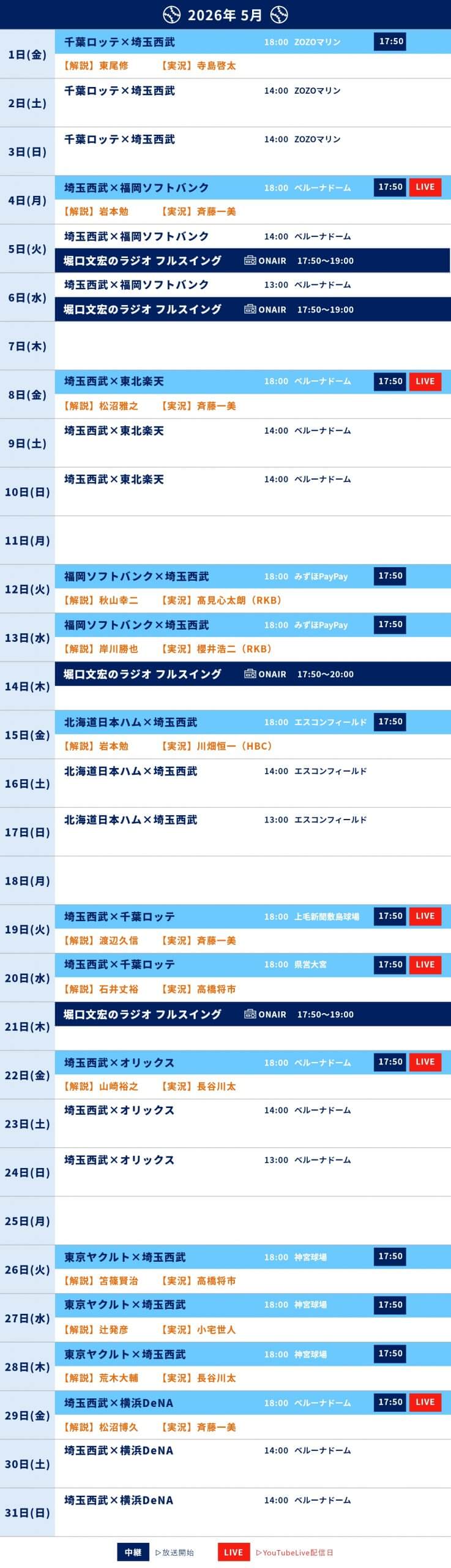 ライオンズナイター放送スケジュール【2026年5月】
