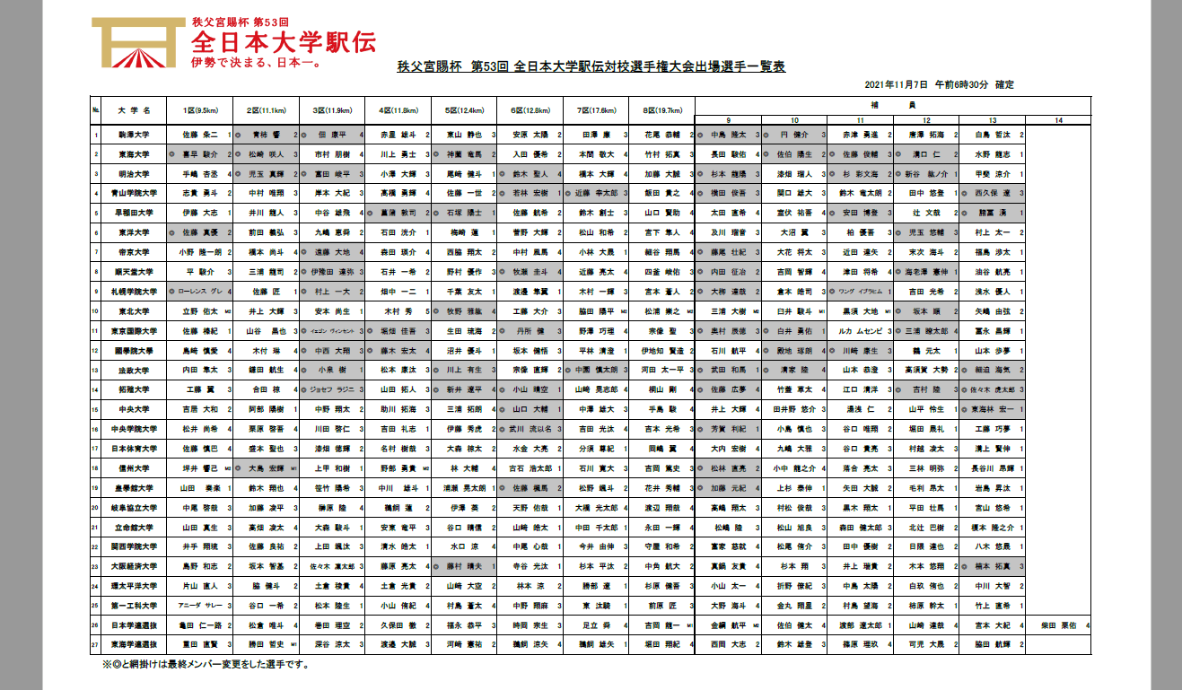 2021年11月7日(日)8時05分スタート 第53回全日本大学駅伝 出場チーム区間エントリー(◎はキャプテン)