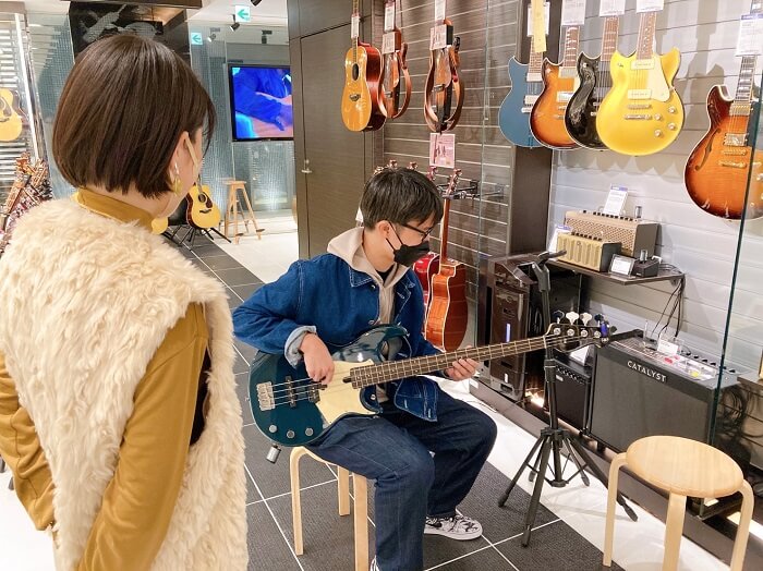 他にも、ベースも様々な種類、かつカラーバリエーションも豊かで見ているだけでもわくわくします。小幡さんが試奏したのは、「BB434」。店内でいろいろ試せるのは魅力的です!