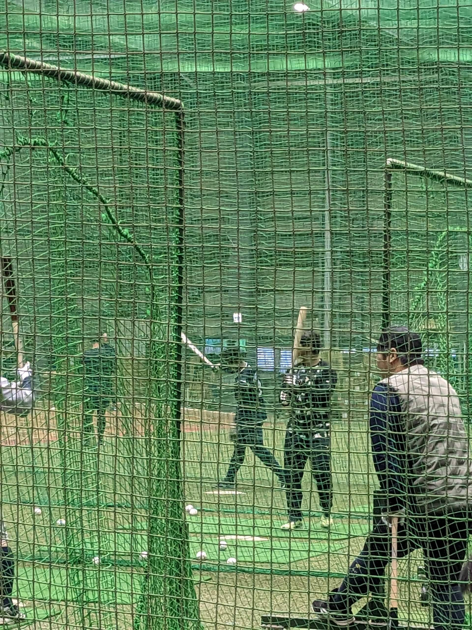 ※共に自主トレをする若手選手の打撃練習を見守る中村剛也選手、時には自らコーチ役となることも。