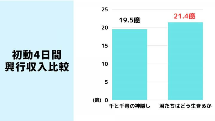 宮崎駿監督最新作映画『君たちはどう生きるか』は、公開4日間で観客動員数が135万人、興行収入が21.4億円を突破した。4日間の興行収入は『千と千尋の神隠し』の公開4日間の興行収入を超え、好発進となっている。