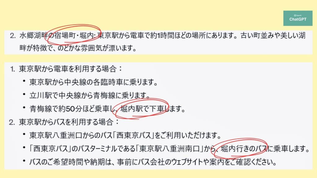 4,ChatGPTの回答を「キッカケ」として扱えばアリかもしれません。「導かれた知らない街に行ったら、歴史や文化を学べた」とか「Aを目指した先で、新たなBにも出会えた」といった具合です。
